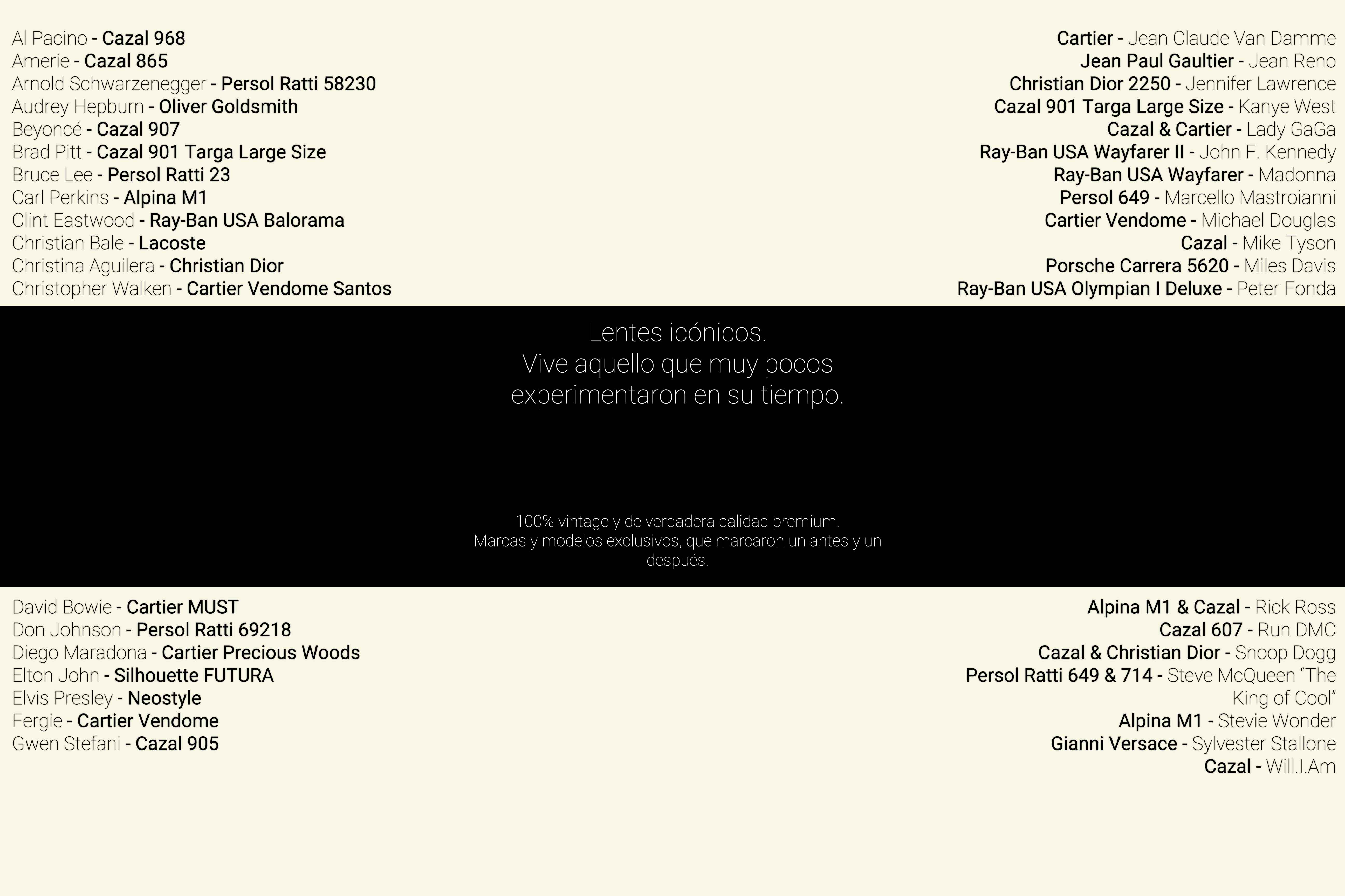 El primer sitio de lentes de marca 100% Vintage y de alta calidad. VintageExperience Libérate de los modelosrepetitivos y pocoinnovadores. Servicios Descubre la gamade servicios queofrecemos. FAQ Respuesta a laspreguntas másfrecuentes. FORMAS DE PAGOY DE ENVÍO Revisa cómo te haremos llegar estos lentes únicos. The Sight of a Few Vive la verdadera calidad vintage My Account